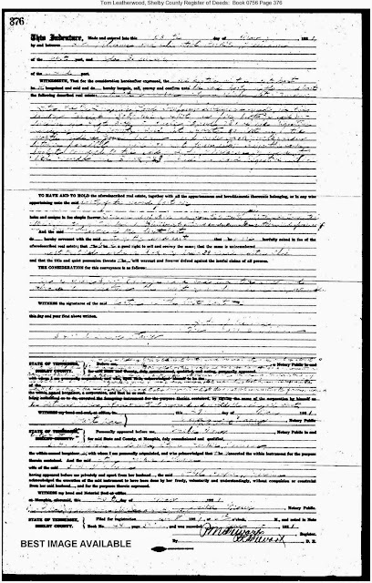 1. Shelby County, Tennessee, Deed Book 756:376, S. H. Williams & wife to Ida B. Slesser, 25 May 1921; digital images, "Property Records," Shelby County Register of Deeds (http://register.shelby.tn.us : accessed 30 Nov 2014).